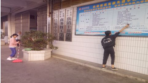 根据学校布置的工作任务,严格落实“门前三包”制度,深度清洁学校门口周边环境,用实际行动助力我市创建全国文明城市。18(7)电子商务班的同学们,已经担负起这份文明创建的责任,在关键的历史时刻,从我做起。